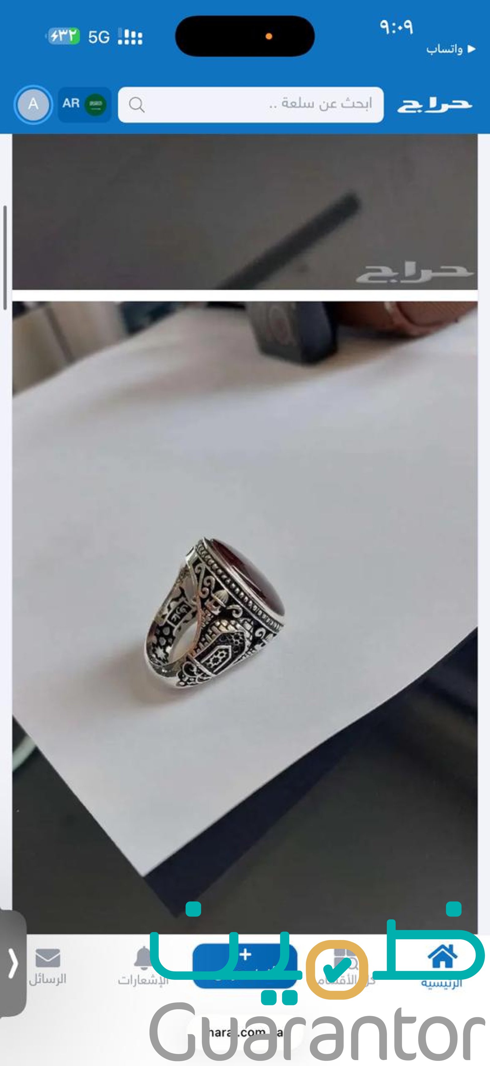 حجر العقيق الكرزي اليمني نخب أول، مُصاغ في خاتم من الفضة عيار 990 صياغة يدويه بنقوش إسلامية من تحف صياغات عارف الأصلية الثقيلة